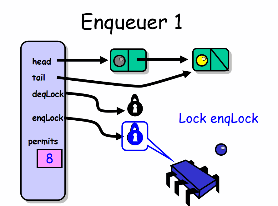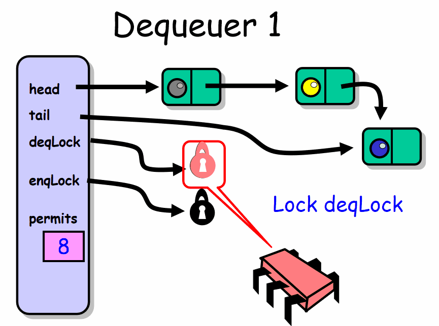 public class UnboundedQueue<T> {ReentrantLock enqLock, deqLock;Node head;Node tail;public UnboundedQueue() {head = new Node(null);tail = head;enqLock = new ReentrantLock();deqLock = new ReentrantLock();}public T deq() throws EmptyException {T result;deqLock.lock();try {if (head.next == null) {throw new EmptyException();}result = head.next.value;head = head.next;} finally {deqLock.unlock();}return result;}public void enq(T x) {if (x == null) throw new NullPointerException();enqLock.lock();try {Node e = new Node(x);tail.next = e;tail = e;} finally {enqLock.unlock();}}protected class Node {public T value;public Node next;public Node(T x) {value = x;next = null;}}}
