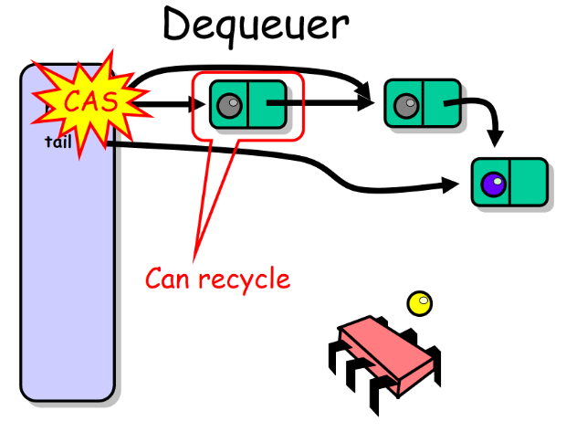 public class LockFreeQueueRecycle<T> {private AtomicStampedReference<Node> head;private AtomicStampedReference<Node> tail;ThreadLocal<Node> freeList = new ThreadLocal<Node>() {protected Node initialValue() { return null; };};public LockFreeQueueRecycle() {Node sentinel = new Node();head = new AtomicStampedReference<Node>(sentinel, 0);tail = new AtomicStampedReference<Node>(sentinel, 0);}private Node allocate(T value) {int[] stamp = new int[1];Node node = freeList.get();if (node == null) { // nothing to recyclenode = new Node();} else { // recycle existing nodefreeList.set(node.next.get(stamp));}// initializenode.value = value;return node;}private void free(Node node) {Node free = freeList.get();node.next = new AtomicStampedReference<Node>(free, 0);freeList.set(node);}public void enq(T value) {// try to allocate new node from local poolNode node = allocate(value);int[] lastStamp = new int[1];int[] nextStamp = new int[1];int[] stamp = new int[1];while (true) { // keep tryingNode last = tail.get(lastStamp); // read tailNode next = last.next.get(nextStamp); // read next// are they consistent?if (last == tail.get(stamp) && stamp[0] == lastStamp[0]) {if (next == null) { // was tail the last node?// try to link node to end of listif (last.next.compareAndSet(next, node,nextStamp[0], nextStamp[0]+1)) {// enq done, try to advance tailtail.compareAndSet(last, node,lastStamp[0], lastStamp[0]+1);return;}} else { // tail was not the last node// try to swing tail to next nodetail.compareAndSet(last, next,lastStamp[0], lastStamp[0]+1);}}}}public T deq() throws EmptyException {int[] lastStamp = new int[1];int[] firstStamp = new int[1];int[] nextStamp = new int[1];int[] stamp = new int[1];while (true) {Node first = head.get(firstStamp);Node last = tail.get(lastStamp);Node next = first.next.get(nextStamp);// are they consistent?if (first == head.get(stamp) && stamp[0] == firstStamp[0]) {if (first == last) { // is queue empty or tail falling behind?if (next == null) { // is queue empty?throw new EmptyException();}// tail is behind, try to advancetail.compareAndSet(last, next,lastStamp[0], lastStamp[0]+1);} else {T value = next.value; // read value before dequeuingif (head.compareAndSet(first, next, firstStamp[0], firstStamp[0]+1)) {free(first);return value;}}}}}public class Node {public T value;public AtomicStampedReference<Node> next;public Node() {this.next = new AtomicStampedReference<Node>(null, 0);}}}