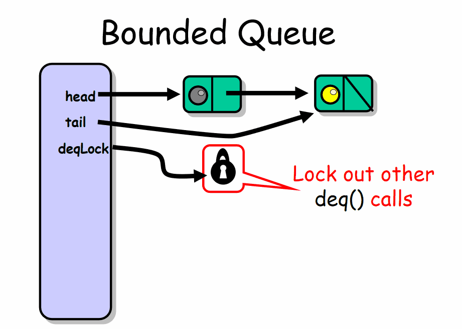 public class BoundedQueue<T> {ReentrantLock enqLock;ReentrantLock deqLock;Condition notEmptyCondition;Condition notFullCondition;AtomicInteger permits;Node head;Node tail;int capacity;public BoundedQueue(int capacity) {this.capacity = capacity;this.head = new Node(null);this.tail = head;this.permits = new AtomicInteger(capacity);this.enqLock = new ReentrantLock();this.notFullCondition = enqLock.newCondition();this.deqLock = new ReentrantLock();this.notEmptyCondition = deqLock.newCondition();}public T deq() {T result;boolean mustWakeEnqueuers = true;deqLock.lock();try {while (permits.get() == capacity) {try {notEmptyCondition.await();} catch (InterruptedException ex) {}}result = head.next.value;head = head.next;if (permits.getAndIncrement() > 0) {mustWakeEnqueuers = true;}} finally {deqLock.unlock();}if (mustWakeEnqueuers) {enqLock.lock();try {notFullCondition.signalAll();} finally {enqLock.unlock();}}return result;}public void enq(T x) {if (x == null) throw new NullPointerException();boolean mustWakeDequeuers = false;enqLock.lock();try {while (permits.get() == 0) {try {notFullCondition.await();} catch (InterruptedException e) {}}Node node = new Node(x);tail.next = node;tail = node;if (permits.getAndDecrement() > 0) {mustWakeDequeuers = true;}} finally {enqLock.unlock();}if (mustWakeDequeuers) {deqLock.lock();try {notEmptyCondition.signalAll();} finally {deqLock.unlock();}}}protected class Node{public T value;public Node next;public Node(T x) {value = x;next = null;}}}