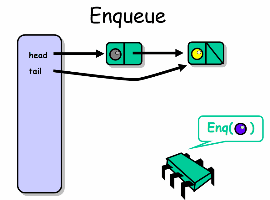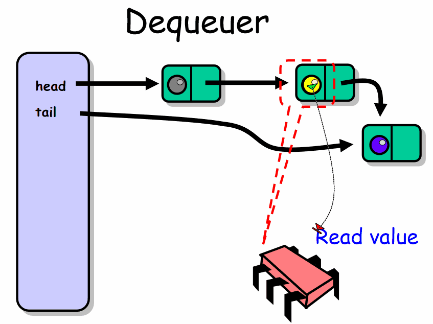 抽象队列的头元素和尾元素并不总是与 head 和 tail 所指向的元素相同,理解这一点是非常重要的。一旦最后一个节点的next域指向了新的节点,一个元素就已经被插入到队列中了,即使入队者还没有更新 tail 域的值。例如,一个线程可以持有 enqLock 的同时插入新节点。假设还没有更新 tail 域。一个并发的出队者线程可以持有 deqLock 这时候就可以获取到新节点,并且可以重设 head 指向新节点。而所有的这些操作都可以在入队者重设 tail 域指向新插入节点之前完成。简单来说就是 head ,tail 域的值并不是绝对准确的。