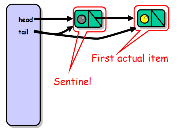 为了保持本章代码示例的简单性,我们假设不允许向队列中存放 null 值。将head域设置为我们的哨兵节点用来标识队列中的头位置。