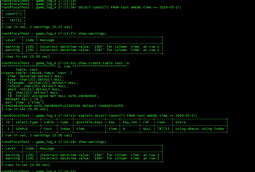 请教个隐式转换的问题:SELECT count(*) FROM test WHERE time >= 2019-05-17;time列是datetime类型,这条SQL的执行结果是相当于 where 1, 这个是什么原因呢?SQL执行有个warnings:Warning | 1292 | Incorrect datetime value: '1997' for column 'time' at row从告警信息来看,是把 2019-05-17 做了数学减法运算,得到常量 1997,再把常量1997转换为 datetime 类型,再跟time字段做比较。但用函数 cast(1997 as datetime),也是同样的告警信息,但结果是 NULL那么该SQL是否可以等价为:SELECT count(*) FROM test WHERE time >= NULL这个SQL结果会是0,因为跟NULL值比较的结果是NULL。虽然WHERE条件错写成一个算式,但执行时没有报错,只有一个告警信息,感觉还是因为发生了类型隐式转换,用不到索引,否则不会是全表扫描。