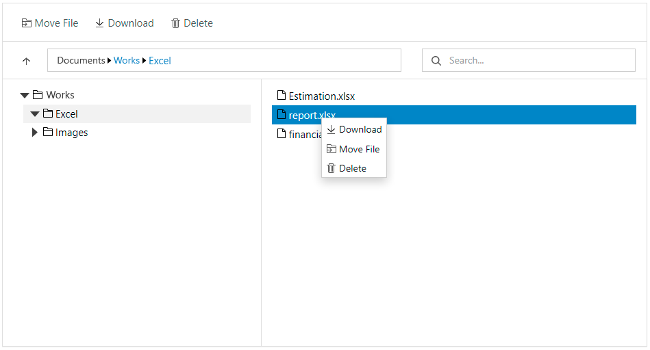 该控件的UI类似于Windows的文件浏览器。它支持通过菜单项来呈现、搜索、移动、上传、删除和下载文件。
