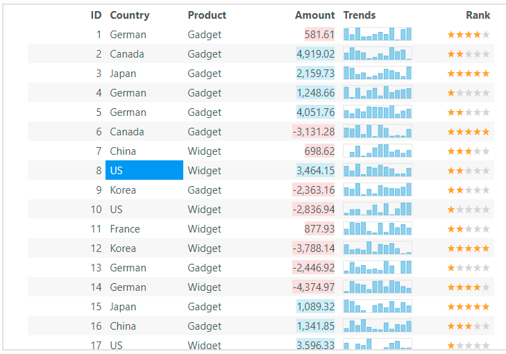在“Amount”列下方的行中,使用HTML来根据单元格值为单元格着色。