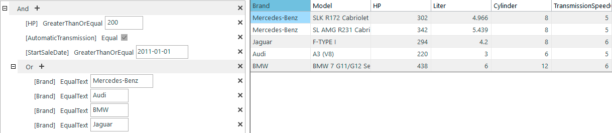此控件与WinForms中的DataFilter控件功能相同,允许用户根据多种条件过滤数据。它可以绑定到任何数据感知类控件,如数据网格、列表、树视图、图表、地图或模型中。