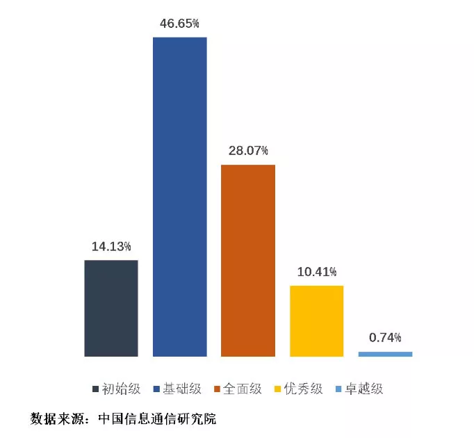 从调查的综合结果可以看出,从调查的综合结果我们可以看出,DevOps经验位于基础级和初始级的企业占比超过七成,18.07%的企业处于全面级,10.41%的企业认为自己已经达到优秀级,卓越级的企业占比为0.74%,28.07%的企业已经在组织内全面推行DevOps实践,并将其贯穿于软件开发的全生命周期中,整体交付效率得到显著提升。下图为总体企业DevOps成熟度现状。