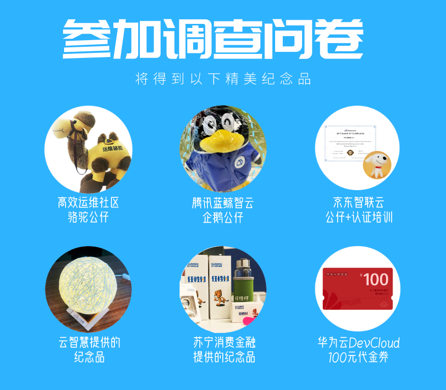 同时,也欢迎将问卷推荐给您认为适合参加本次调查的专业人士。我们将赠送给部分幸运受访者由高效运维社区、腾讯蓝鲸智云、京东智联云、云智慧、苏宁消费金融、华为云DevCloud等企业赞助的纪念品,以感谢各位的热情参与,因此请填写准确联系方式和地址,以便纪念品发放,部分纪念品如下图所示。在此,也感谢各位合作单位对本次调查的大力支持!