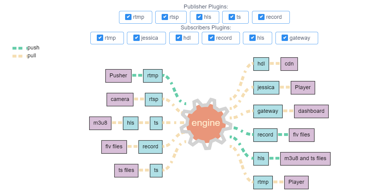 其内置插件提供了流媒体服务器的常见功能,例如 rtmp server、http-flv、视频录制、QoS 等。此外还内置了后台 Web 界面,方便观察服务器运行的状态。也可以自己开发后台管理界面,通过 API 方式获取服务器的运行信息。Monibuca 还提供了可供定制化开发的插件机制,可以任意扩展其功能。