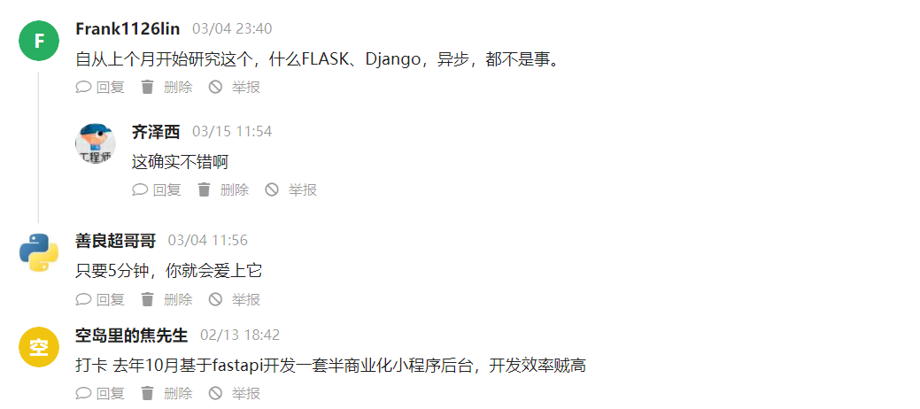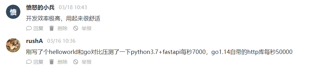 赞赏的声音确实很多,被顶至前三自然不令人意外。有人做对比实验后指出 FastAPI 与 Go 还是有些距离。后起之秀需要成长空间,但同时发展潜力也是巨大的。