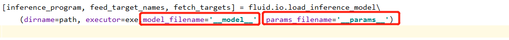 2. 该代码由于使用的模型文件是《__model__和__params__》,因此在使用load_inference__model时候,必须在该函数的参数中指明这两个名字。