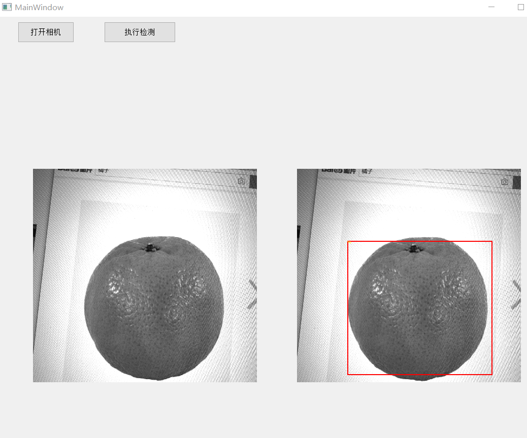 2. 创建多线程检测机制,分别给两个Button设置不同的槽函数,分别用于触发相机拍照和调用检测函数。运行infe_video.py可得到如下结果。由于作者使用的是黑白相机拍摄电脑屏幕上百度搜索出来的橘子照片,检测效果质量不高。