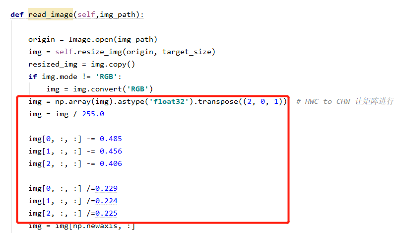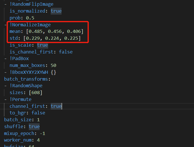 3. 该代码中需要着重注意一下一点:由于预测加载的模型是使用yolov3训练出来的模型,因此在进行预测时要考虑图像归一化的操作,数据归一化的操作来源训练该模型的config文件,输入图像大小需要和export model时设置的图像大小保持一致