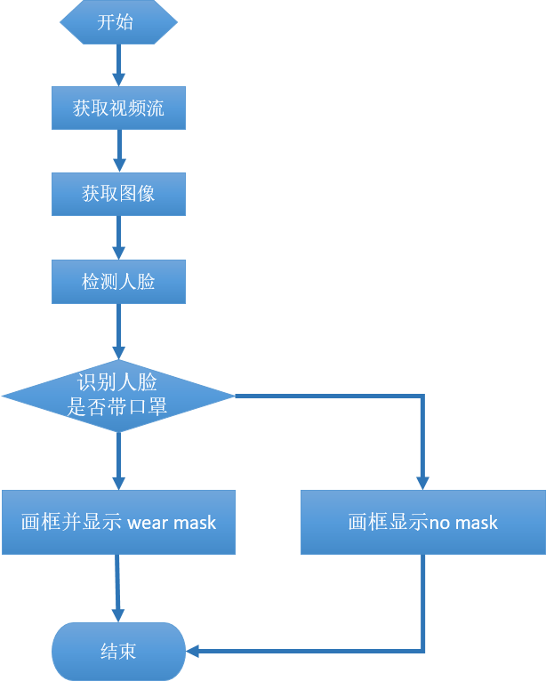 如图3所示,软件系统的整体流程是先获取视频流,然后转成图像,基于图像,做人脸检测,如果检测到人脸,再基于口罩识别模型判断人脸是否佩戴口罩;根据识别结果,画框并显示口罩是否佩戴。核心的思想是先进行人脸检测,再去分类是否佩戴口罩。