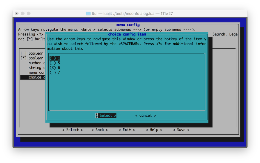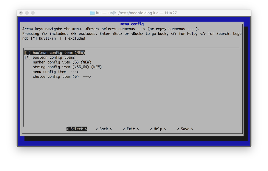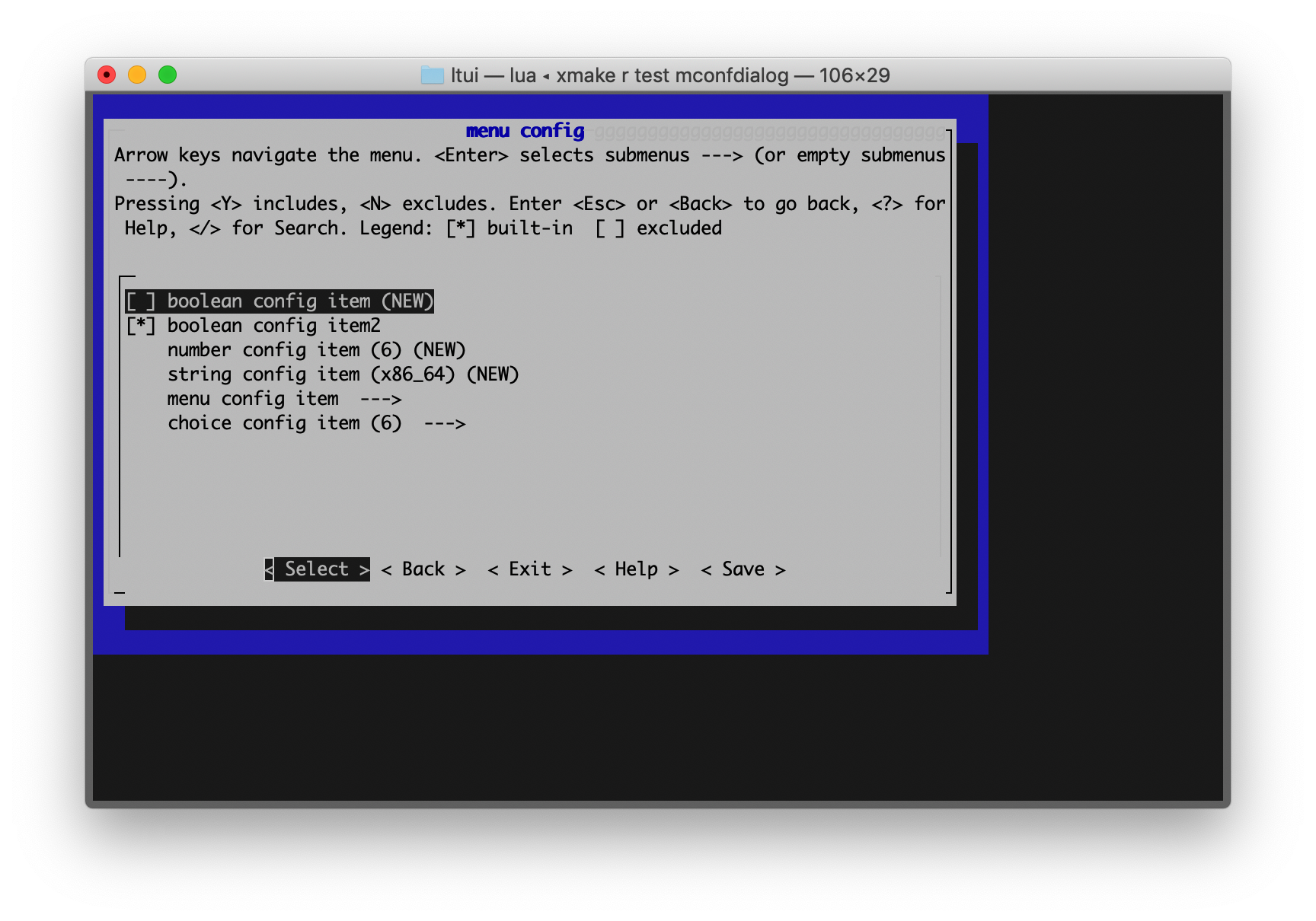 此框架源于xmake中图形化菜单配置的需求,类似linux kernel的menuconf去配置编译参数,因此基于curses和lua实现了一整套跨平台的字符终端ui库。 而样式风格基本上完全参照的kconfig-frontends,当然用户也可以自己定制不同的ui风格。
