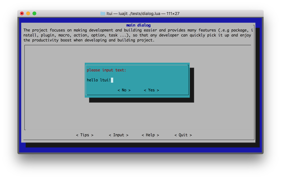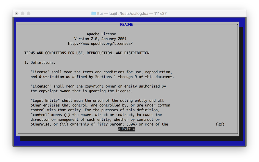 如果要运行自带的测试,你需要先安装lua或者luajit程序去加载运行ltui源码仓库中的测试程序: