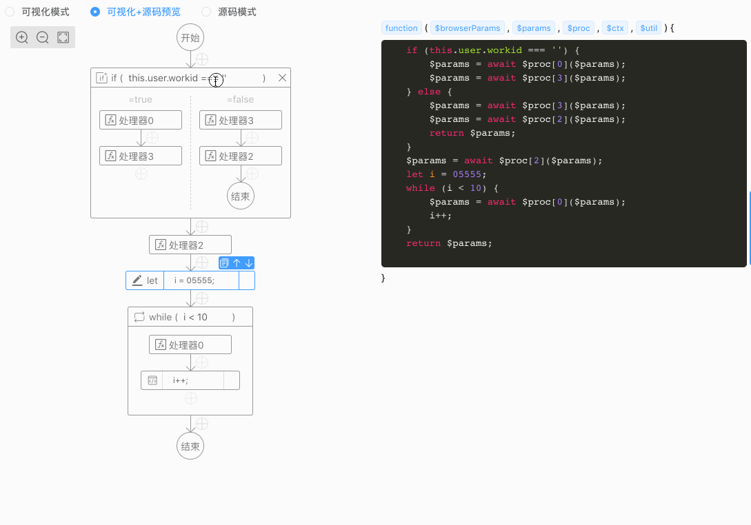 按照这个设想,陆游平台的可视化编排很快便扩展了复杂编排的能力,同时,实现过程中甚至加入了所见即所得的左边编排、右侧预览源码模式。