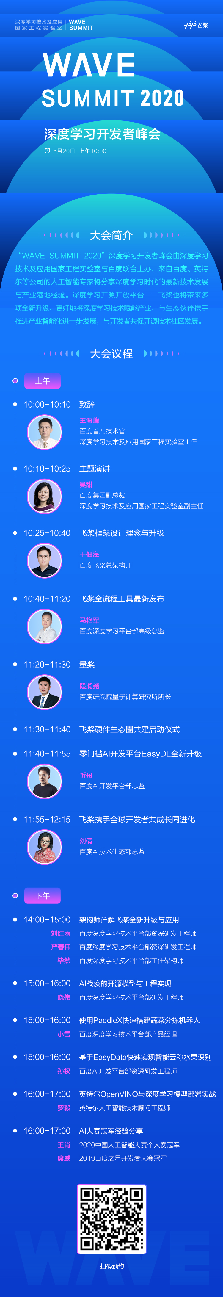 “WAVE SUMMIT 2020”深度学习开发者峰会官网:https://www.wavesummit.com.cn/web/index.html?hmsr=oschina&hmpl=&hmcu=&hmkw=&hmci=,立即报名参加吧。