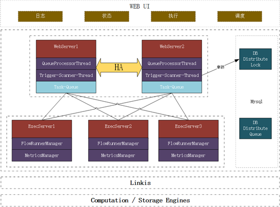 如上图所示,在技术架构层面上,Schedulis的三个主要核心数点是: WebServer,ExecServer以及DB。