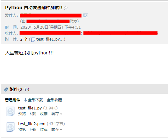 if __name__ == "__main__": mail_conf = { 'msg_from': 'xxxx@qq.com', # 邮件发送者的地址 'receives': ['xxxx@qq.com', 'xxxxxxxx@xxxx.com', ], # 邮件接收者的地址,这是个list,因为邮件的接收者可能不止一个 'msg_subject': 'Python 自动发送邮件测试!!', # 邮件的主题 'msg_content': '人生苦短,我用python!!!', # 邮件的内容 'attach_file_list': {"test_file1.py": "test.py", "test_file2.pem": "./public.pem"}, # 为附件文件路径列表,也是个list,也可没有这项 } manager = SendEmailManager(**mail_conf) manager.do_send_mail()