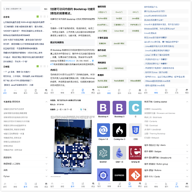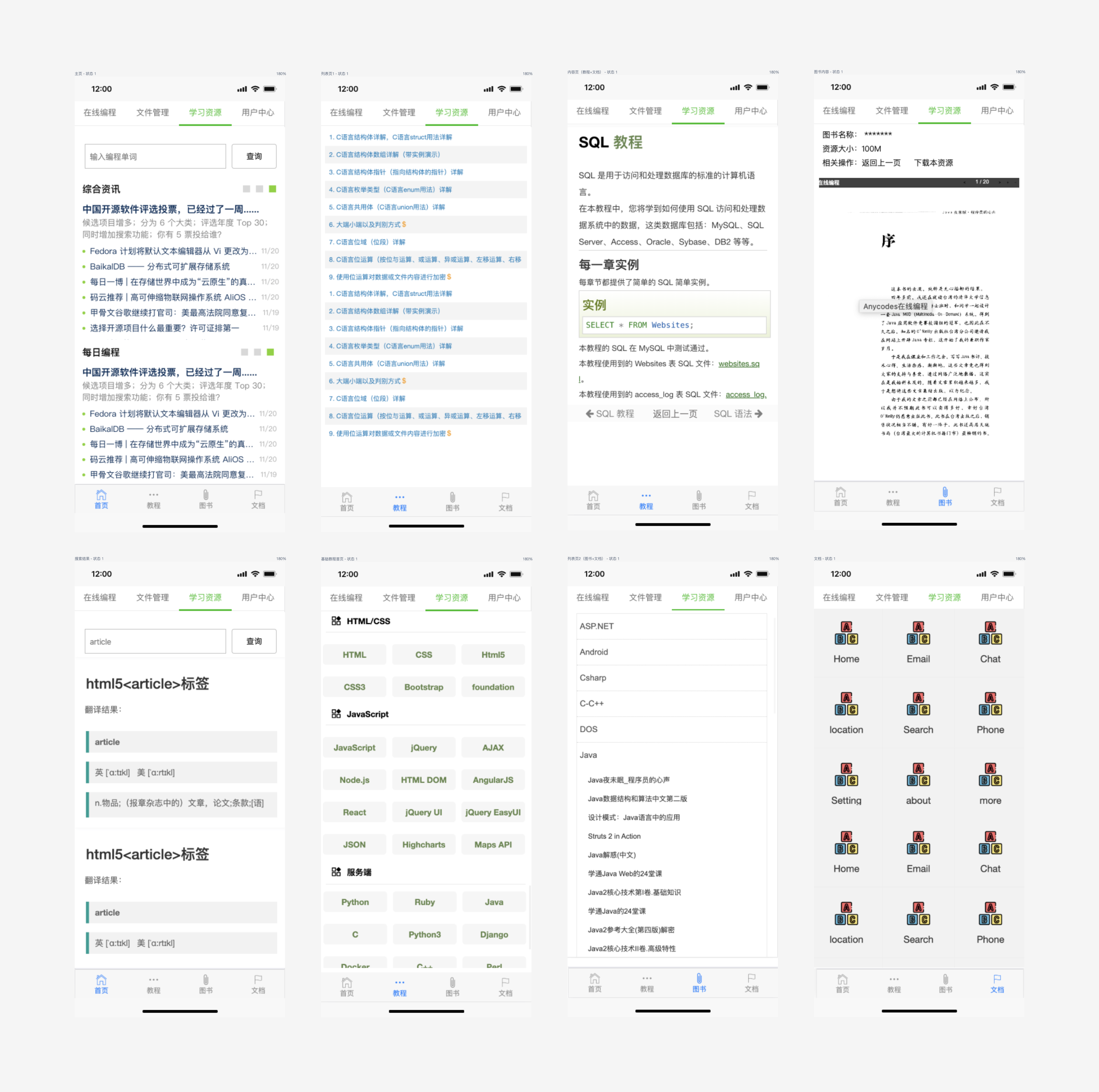 前端设计,预计在学习资源部分需要有 8 个页面,主要就是科技类新闻、教程、文档、图书等相关功能,通过墨刀绘制的原型图如下:
