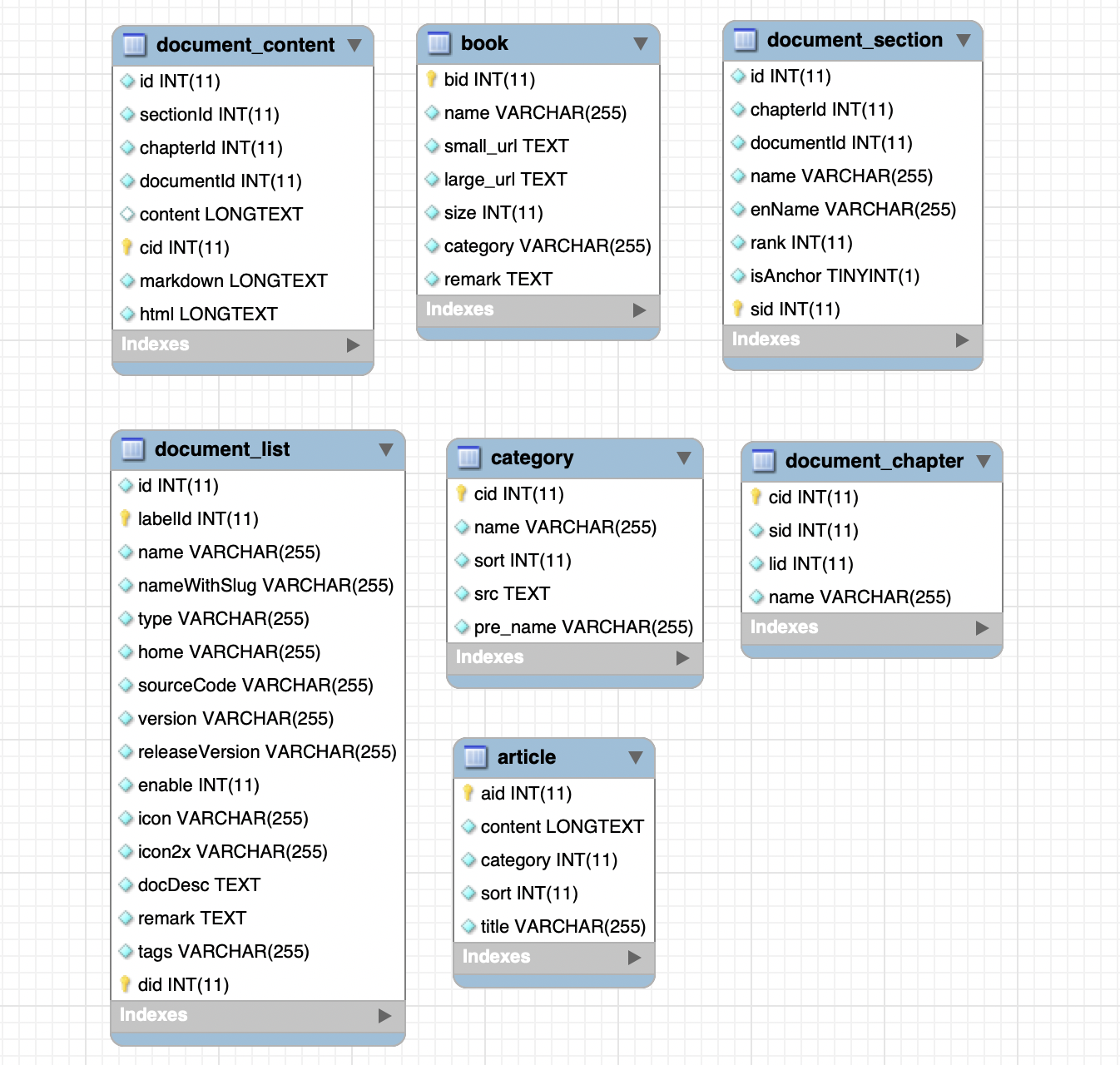 在这个数据库中,四个模块分别是:新闻文章、开发文档、基础教程以及图书资源。其中开发文档包括大分类,子列表以及正文等内容,这里表关联并没有使用外键,而是直接用的 ID 进行表之间的关联。
