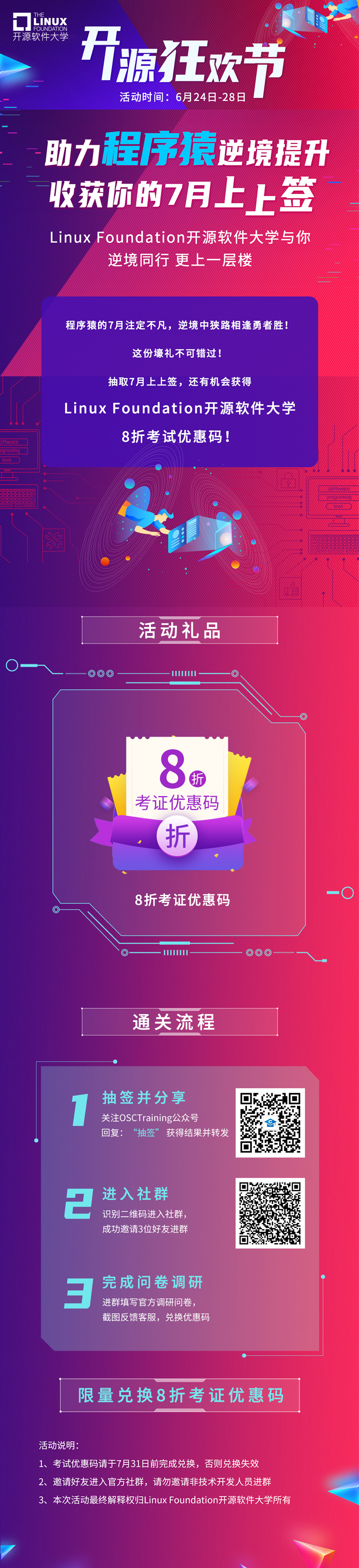 本次活动由Linux Foundation开源软件大学主办,参与者将有机会获得你想学习的官方正价课程和考试8折优惠码,限量发送,先到先得!