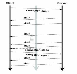 - Server-Sent events:SSE 与 长轮询机制类似,区别是每个连接不只发送一个消息。客户端发送一个请求,服务端就保持这个连接直到有一个新的消息已经准备好了,那么它将消息发送回客户端,同时仍然保持这个连接是打开,这样这个连接就可以用于另一个可用消息的发送。一旦准备好了一个新消息,通过同一初始连接发送回客户端。客户端单独处理来自服务端传回的消息后不关闭连接。所以,SSE 通常重用一个连接处理多个消息(称为事件)。SSE 还定义了一个专门的媒体类型 text/event-stream,描述一个从服务端发送到客户端的简单格式。SSE 还提供在大多数现代浏览器里的标准 javascript 客户端 API 实现。关于 SSE 的更多信息,请参见 SSE API 规范。