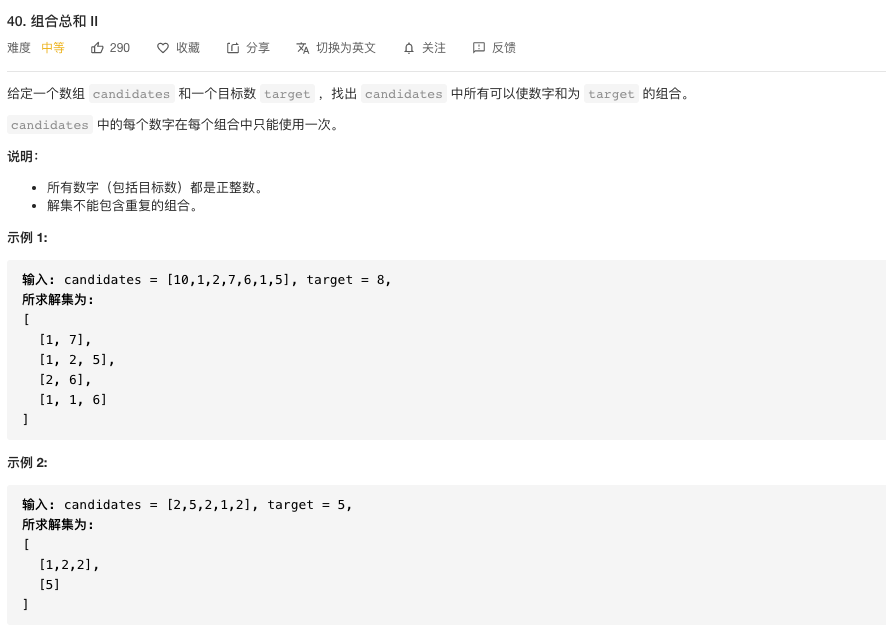 你一看题目是不是就发现,差不多啊,确实,这里只是每个数字只能用一次,同时也是不能包含重复的组合,所以,用上面的去重方法解决咯。话不多说,上代码。