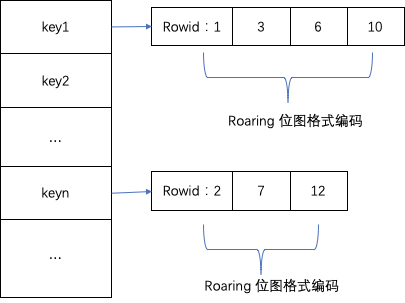 BitMap创建时需要通过 CREATE INDEX 进行创建。Bitmap的索引是整个Segment中的Column字段的索引,而不是为每个Page单独生成一份。在写入数据时,会维护一个map结构记录下每个key值对应的行号,并采用Roaring位图对rowid进行编码。主要结构如下: