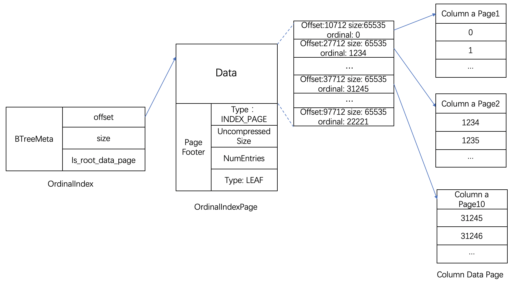 Ordinal Index索引提供了通过行号来查找Column Data Page数据页的物理地址。Ordinal Index能够将按列存储数据按行对齐,可以理解为一级索引。其他索引查找数据时,都要通过Ordinal Index查找数据Page的位置。因此,这里先介绍Ordinal Index索引。