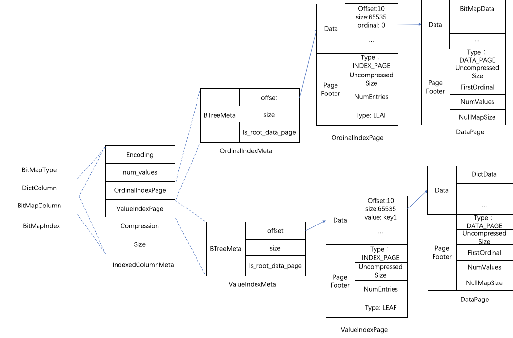 BitmapIndex的meta信息同样存放在SegmentFootPB中,BitmapIndex包含了三部分,BitMap的类型、字典信息DictColumn、位图索引数据信息BitMapColumn。其中DictColumn、BitMapColumn都对应IndexedColumnData结构,分别存放了字典数据和索引数据的Page地址offset、大小size。这里同样做了二级page的优化,不再具体阐述。