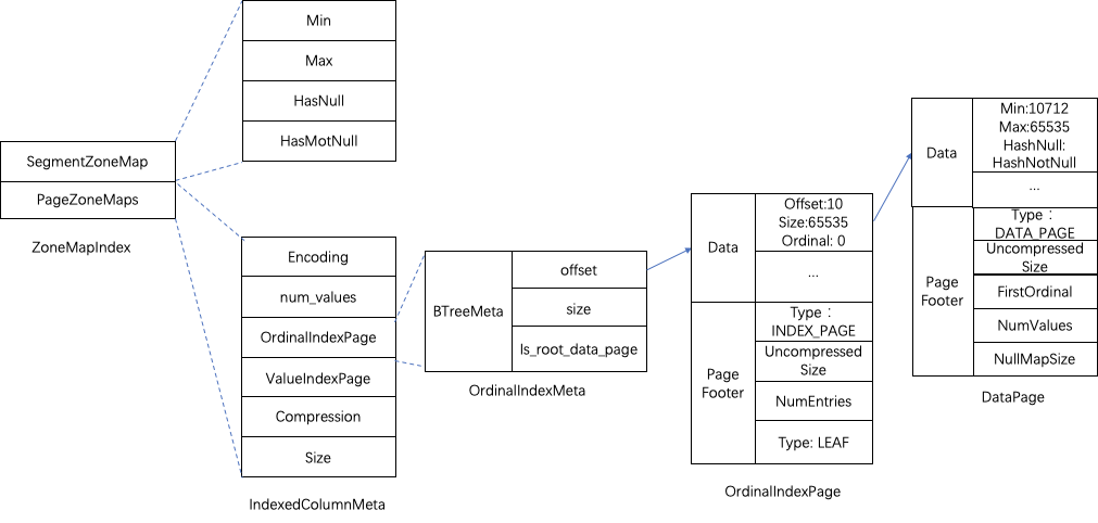 PageZoneMaps对应了索引数据存放的Page信息IndexedColumnMeta结构,目前实现上没有进行压缩,编码方式也为Plain。IndexedColumnMeta中的OrdinalIndexPage指向索引数据root page的偏移和大小,这里同样做了优化二级Page优化,当仅有一个DataPage时,OrdinalIndexMeta直接指向这个DataPage;有多个DataPage时,OrdinalIndexMeta先指向OrdinalIndexPage,OrdinalIndexPage是一个二级Page结构,里面的数据项为索引数据DataPage的地址偏移offset,大小Size和ordinal信息。