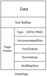 Data部分存放了当前Page的列的数据。当允许存在Null值时,对空值单独存放了Null值的Bitmap,由RLE格式编码通过bool类型记录Null值的行号。