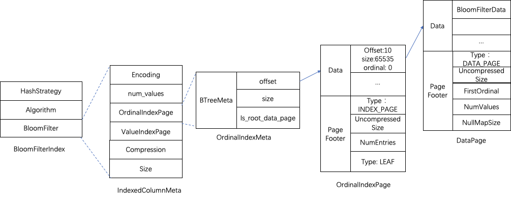 BloomFilterIndex信息存放了生产的Hash策略、Hash算法和BloomFilter过对应的数据Page信息。Hash算法采用了HASH_MURMUR3,Hash策略采用了BlockSplitBloomFilter分块实现策略,期望的误判率fpp默认配置为0.05。BloomFilter索引数据对应数据Page的存放与ZoneMapIndex类似,做了二级Page的优化,这里不再详细阐述。
