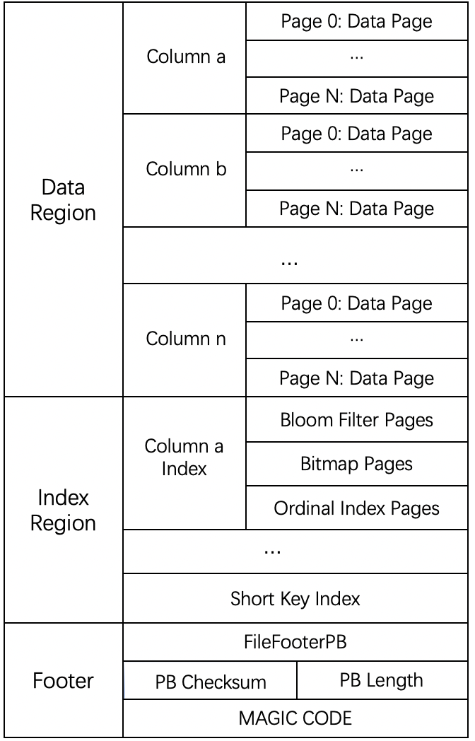 - Index Region: Doris中将各个列的index数据统一存储在Index Region,这里的数据会按照列粒度进行加载,所以跟列的数据信息分开存储