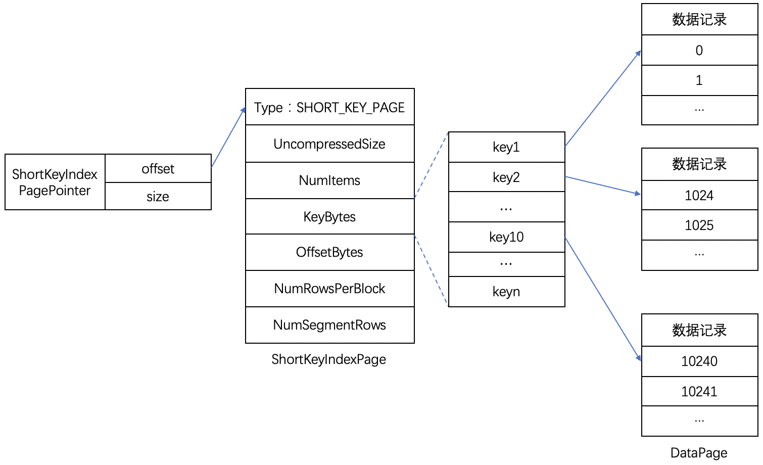 其中,KeyBytes中存放了索引项数据,OffsetBytes存放了索引项在KeyBytes中的偏移。