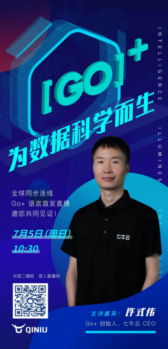 那么,Go+ 到底是一门怎么样的开发语言?7 月5 日(周日)上午10:30 ,七牛云 CEO 许式伟将在本次直播中阐述 Go+ 的诞生和未来发展。并与蚂蚁金服研究员王益和《Go 语言高级编程》作者柴树杉共同解答 :Go+ 将会在哪些领域发挥特长?Go+ 在科学计算上有什么优势?Go+ 与 Python 有哪些区别?等大家关心的 Go+ 问题。在这里,所有的开发者都可以畅所欲言,零距离感知 Go+ 。本次直播将在 B 站、抖音、斗鱼同步播出,更有 Go+ 全球首个社区公布,期待您的到来。