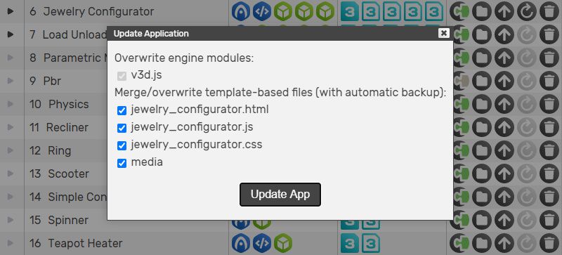 合并/覆盖机制已默认启用,但您可以在更新时取消勾选。所有在列的Verge3D官方示例应用都使用此功能进行更新。为防止在您更改了默认的HTML/CSS/JS文件后,自动合并失败所可能导致的数据丢失,现在更新应用时将备份文件到 your_app/v3d_app_data/update_backup 文件夹中。
