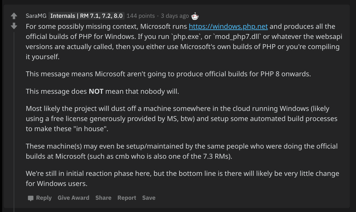 这意味着什么呢?有人留言解释:微软运行 https://windows.php.net 并为 Windows 生产所有正式的 PHP 版本。如果你运行 php.exe 或 mod_php7.dll 或实际调用的任何 websapi 版本,那么你要么使用微软自己的 PHP 版本,要么自己编译。