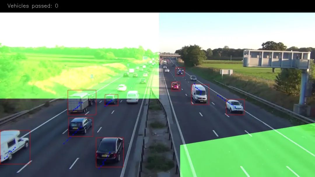 # count vehicles and drop counted pathes:new_pathes = []for i, path in enumerate(self.pathes):d = path[-2:]if (# need at list two points to countlen(d) >= 2 and# prev point not in exit zonenot self.check_exit(d[0][1]) and# current point in exit zoneself.check_exit(d[1][1]) and# path len is bigger then minself.path_size <= len(path)):self.vehicle_count += 1else:# prevent linking with path that already in exit zoneadd = Truefor p in path:if self.check_exit(p[1]):add = Falsebreakif add:new_pathes.append(path)self.pathes = new_pathescontext['pathes'] = self.pathescontext['objects'] = objectscontext['vehicle_count'] = self.vehicle_countself.log.debug('#VEHICLES FOUND: %s' % self.vehicle_count)return context