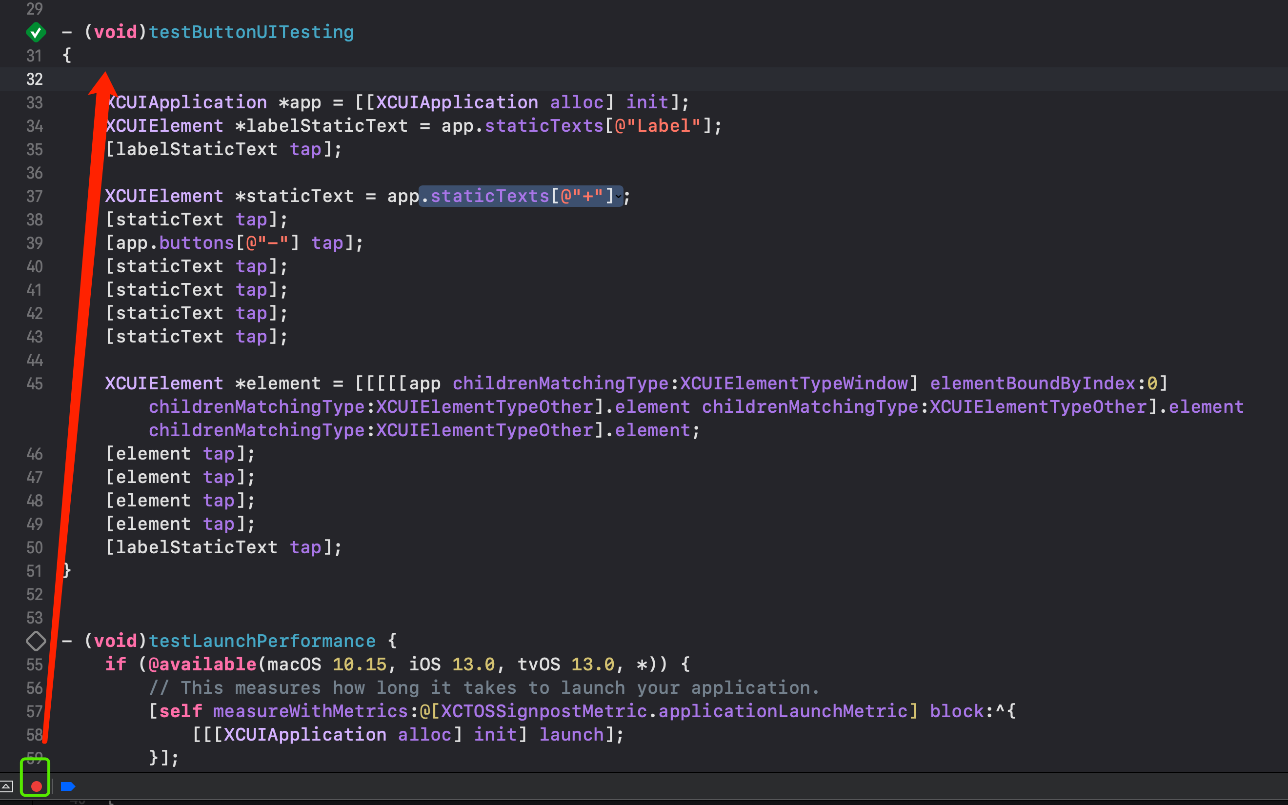 - 像单元测试意义,UI 测试方法命名以 test 开头。将鼠标光标移到方法内,点击 Xcode 左下方的红色按钮,开始录制 UI 脚本。