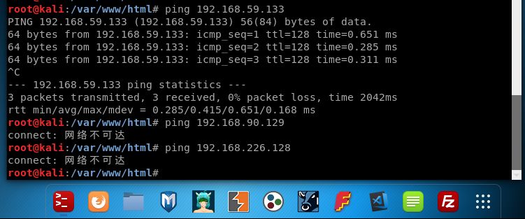 至此,我们本次试验的3层网络靶场已经搭建完毕,攻击者的kali只能访问第一层网络,而无法访问第二层和第三层的靶机: