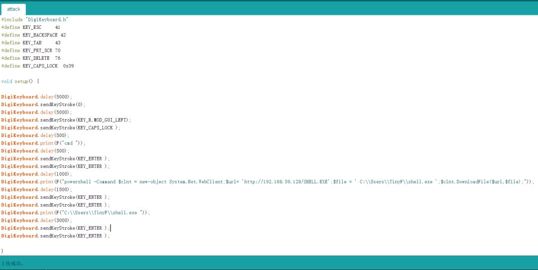 编写好代码后,我们就可以点击“上传”按钮,然后插入BadUSB设备,一款简易BadUSB就做好了。