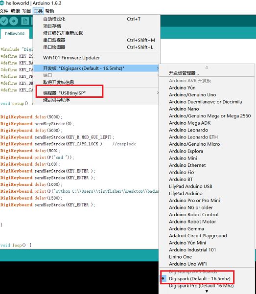 Arduino IDE用于烧录代码的编译器,可以将我们的恶意代码烧录到BadUSB中,配置好相关参数,将开发板设为Digispark,编程器设为USBtinyISP: