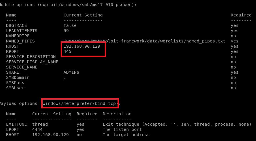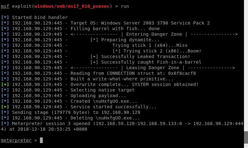 虽然wannacry事件已经过去一年多了,内网里存在ms17-010漏洞的情况在各个行业并不少见,在这次模拟环境中,第二层网络win2003就存在这个漏洞,我们可以利用msf直接对ms17-010进行利用,拿到shell,配置攻击参数,由于第二层服务器无法直接和攻击者的kali进行通信,所以这里注意payload要设置为bind_tcp,即采用正向代理的模式。
