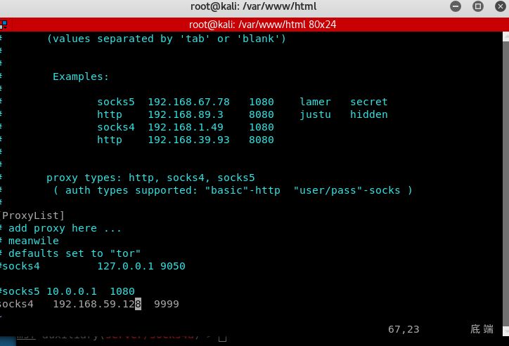 修改/etc/proxychains.conf,将里面的服务器和端口设置为msf socksserver的信息: