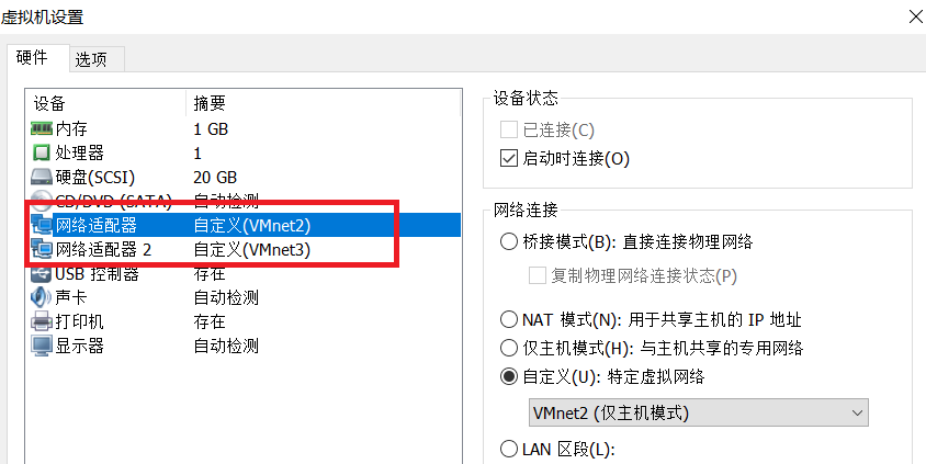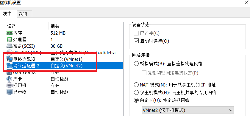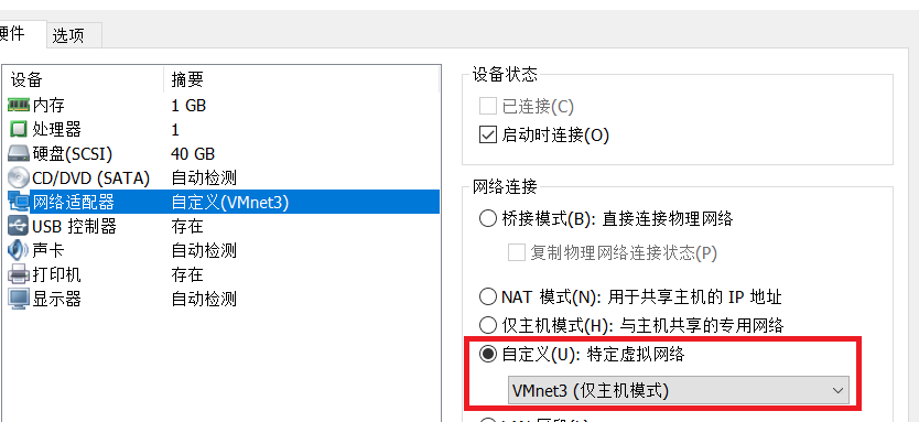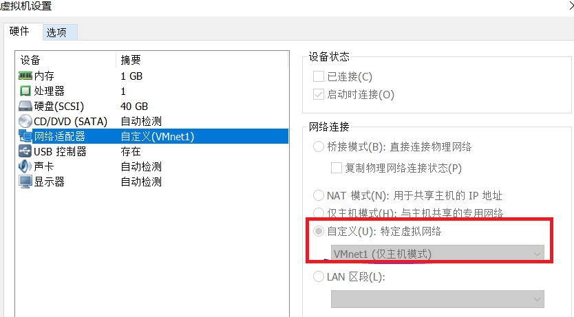 我们将kali设为第一层网络vmnet1,在网络适配器中选择自定义vmnet1: