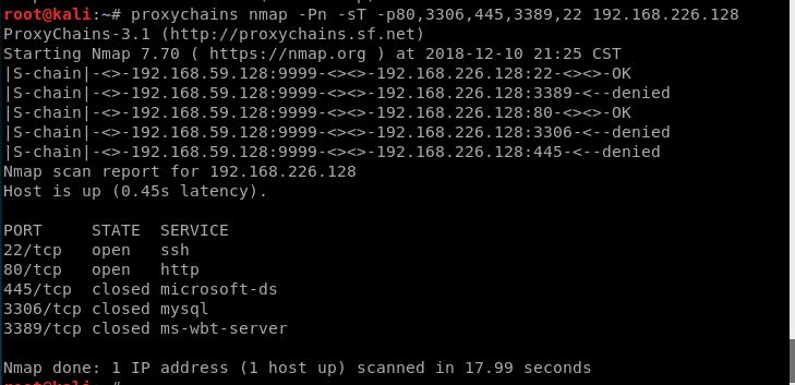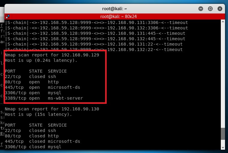proxychains nmap -Pn -sT -p80,3306,445,3389,22 192.168.90.129-132