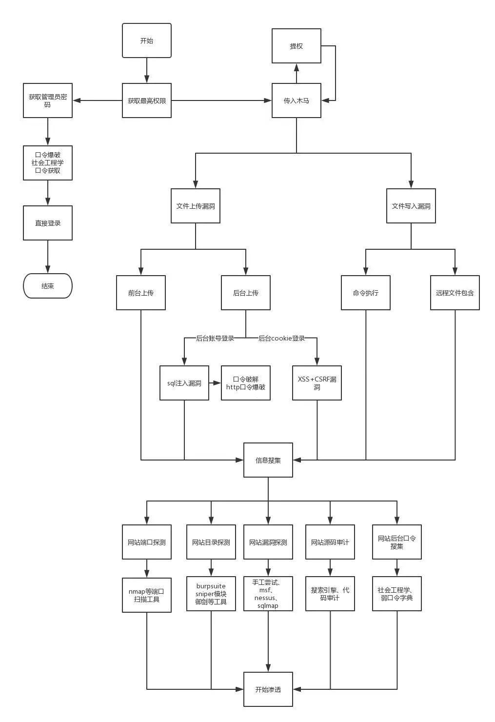 至此,我们通过BadUSB让第一层网络中的win7系统下载并运行我们的恶意软件,然后通过MSF利用MS17-010、口令爆破、web渗透等方式穿透三层内网,最终拿下第三层网络系统的权限。常见的渗透思路可以参考下面的脑图: