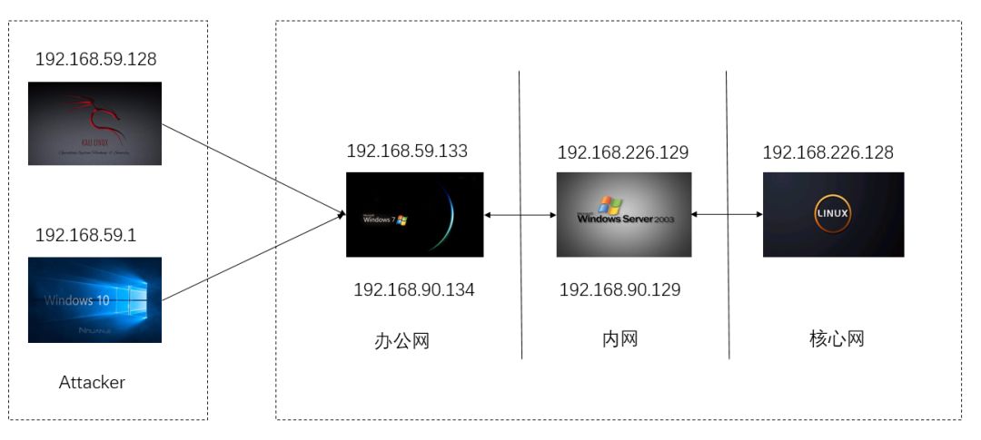 第一层网络,模拟企业办公网,为一台win7的员工办公电脑,第二层网络模拟内网,是一台win2003服务器,第三层网络为企业核心网,为一台Linux服务器。攻击者的攻击机有kali和win10。